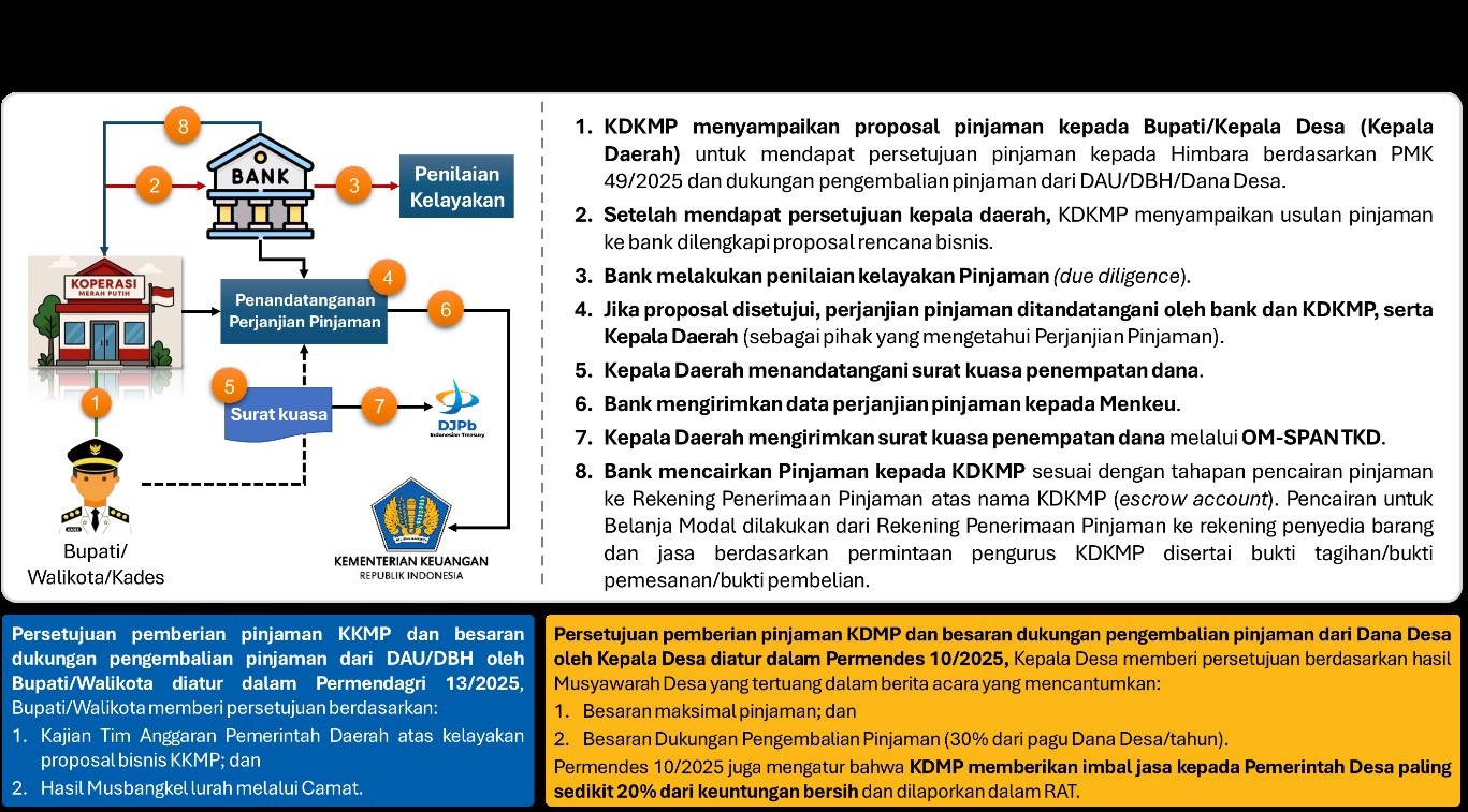 Mekanismenya diatur dalam Peraturan Menteri Keuangan Nomor 49 Tahun 2025 (PMK 49/2025) tentang Tata Cara Pinjaman Dalam Rangka Pendanaan KDKMP.